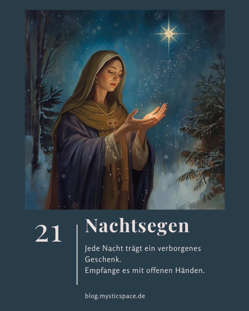 Diese Nacht segnet durch Reifung und Sammlung. Ein leiser Auftrag wird in das Herz gelegt, der den Weg des neuen Jahres erhellt. Die Wintersonnenwende erinnert daran, dass das Licht sanft zurückkehrt und sich aus der Tiefe erhebt.