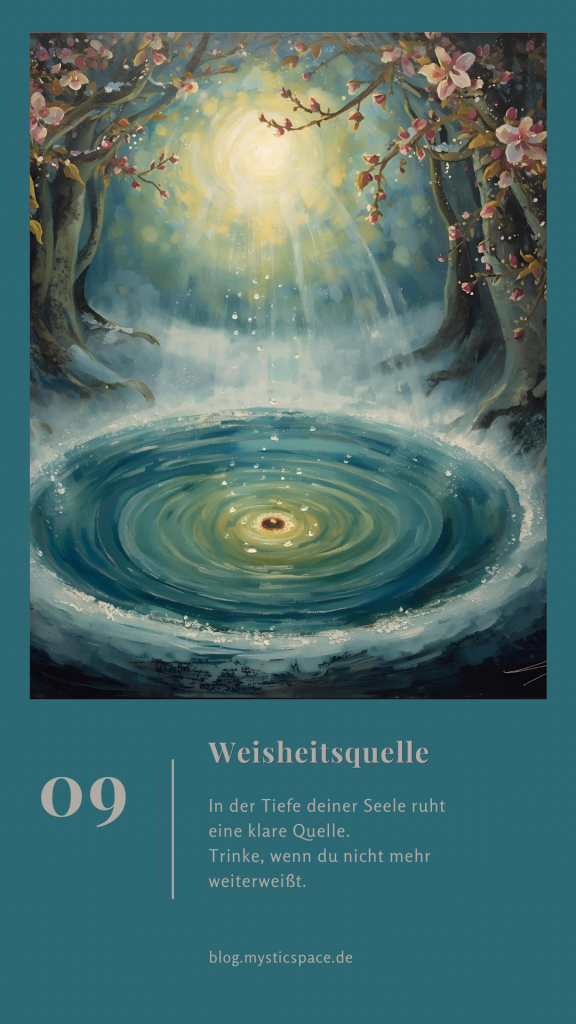Wenn du nicht mehr weiterweißt, wenn Wege sich vernebeln oder Fragen schwer werden, dann lädt dich die Quelle deiner Seele ein, hinabzusteigen in diesen inneren Brunnen. Dort sprudelt jenes klare Wasser, das dich an deine Wahrheit erinnert: an deine Würde, deine Kraft, deine Intuition, an die urweibliche Weisheit, die dich seit Anbeginn trägt. Trinkst du davon, kostest du von deiner ureigenen „Medizin“ die dich reinigt und klärt. Nebelschleier verlieren sich und dein Geist wird klar. Wegweisende Weisheit schenkt dir eine offene Zukunftsperspektive und ein erweitertes Bewusstsein für neue Eingebungen.