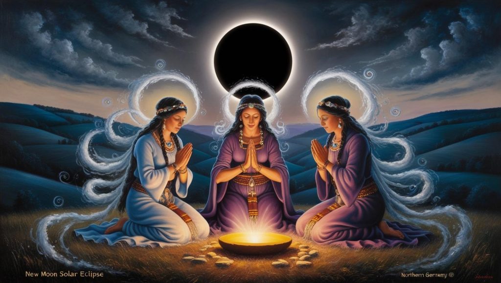 In sanfter, alter Sprache der weisen Frauen rufe ich die Kräfte von Sonnenfinsternis und Neumond an –