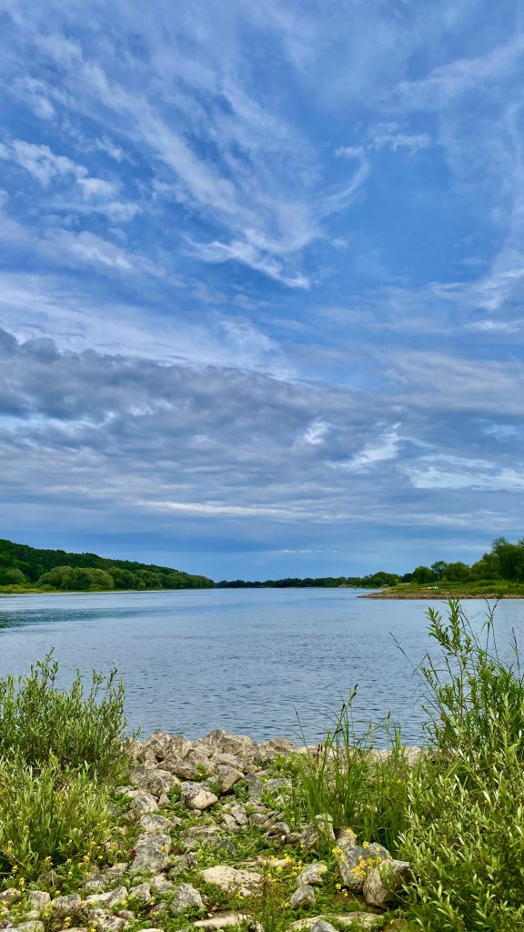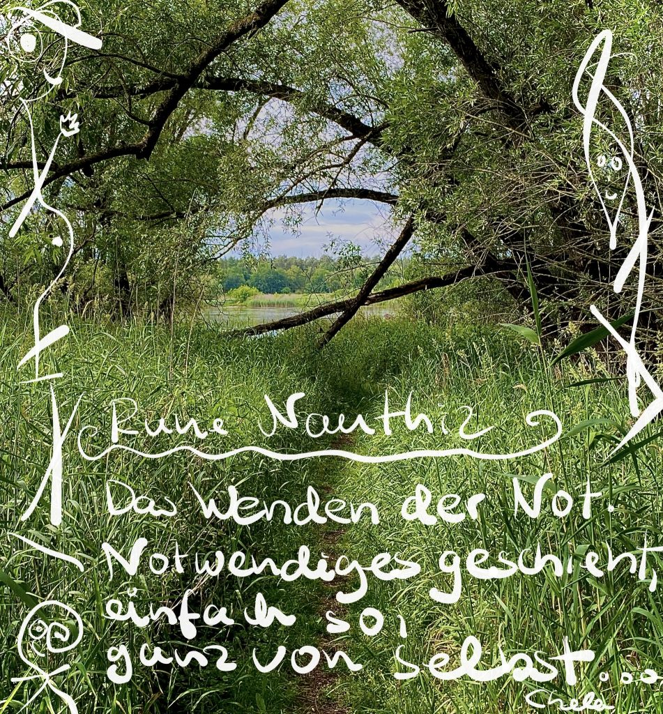 Auf meinem Medicinewalk kreuzten sich Baumstämme in Form der Rune Nauthiz. Ich krabbelte hindurch, gespannt welche Medizin ich hinter der Rune finden würde. Das „Dahinter“ symbolisiert für mich den sich eröffnenden Heilraum, das was sich als Zukunftsvision zeigt, wenn die Not gewendet ist. Ich kam an ein großes Feld voller Sumpfschwertlilien, die mir ihre Heilvision und Heilinformation offenbarten. Ich hielt in Trance versunken mit den Spirits Zwiesprache. Ein aufkommender kühler Wind richtete meinen Blick auf die hinter dem Deich aufziehenden dunklen Regenwolken. Sofort verabschiedete ich mich von den Pflanzenwesen, machte mich auf den Rückweg. Vor meinen Füßen lag ein Teil von einer Uhr. Die Uhrzeit blinkte 15 Minuten vor der realen Zeit. Ich bedankte mich für die geschenkte Zeit, kam rechtzeitig ins Trockene.