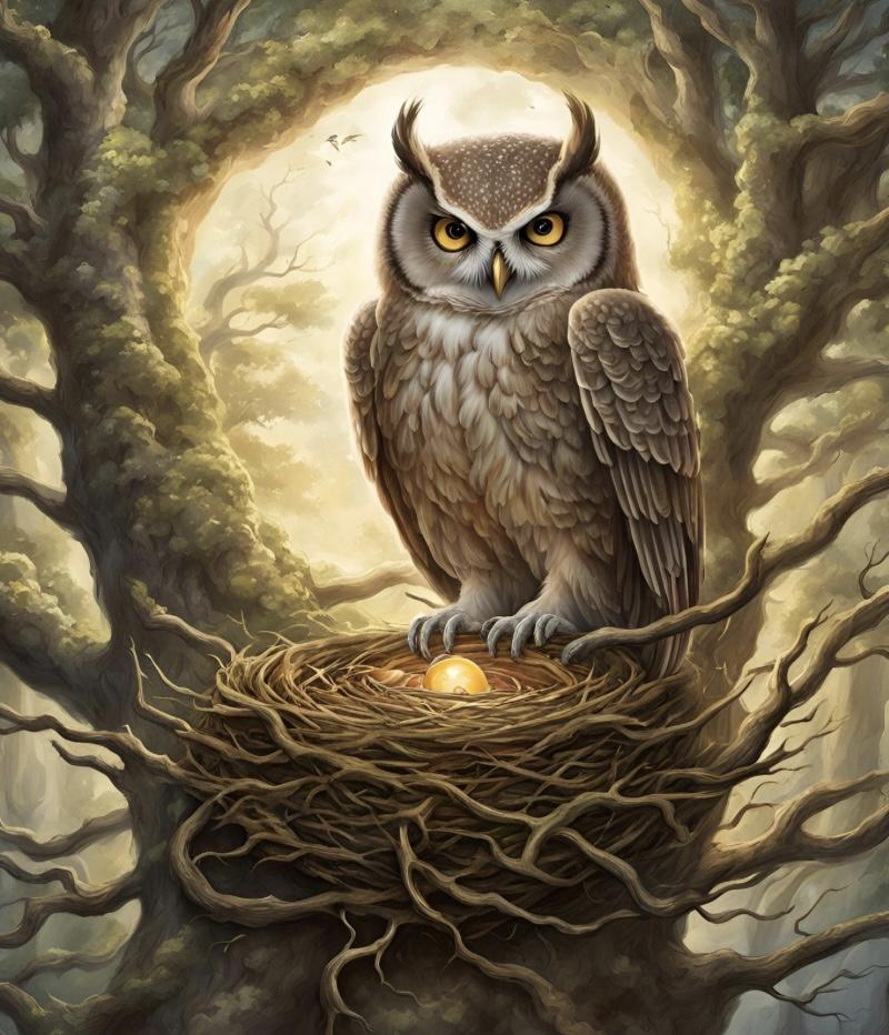 Inmitten der Krone liegt das Nest der Eule, umgeben von einem schimmernden Licht. Die Eule erwartet dich. Mit ihren großen, durchdringenden Augen blickt sie dich an. Sie spricht:
