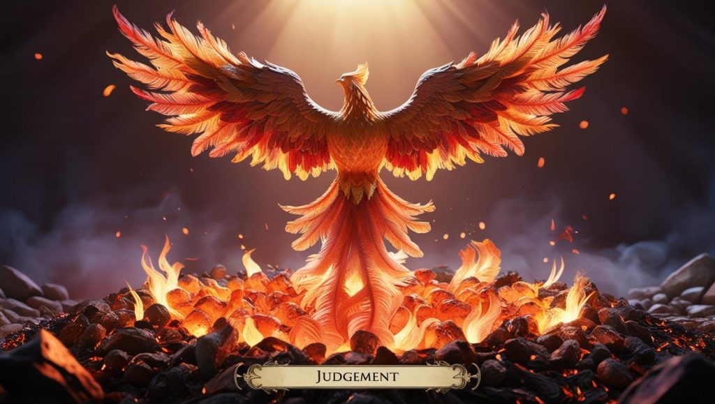 In der schamanischen Tradition weiser Frauen verkörpert die Karte „Judgement“ auch den strahlenden Phönix als Krafttier, der sich aus den lodernden Flammen und den kühlen Aschen der kreativen Zerstörung erhebt. Dieser mythische Vogel, der immer wieder neu geboren wird, lehrt uns, dass in jedem Ende auch ein Neuanfang liegt – eine Lektion, die uns dazu auffordert, aus vergangenen Erfahrungen zu lernen und die wiederhergestellte Ordnung in unser Leben zu integrieren.