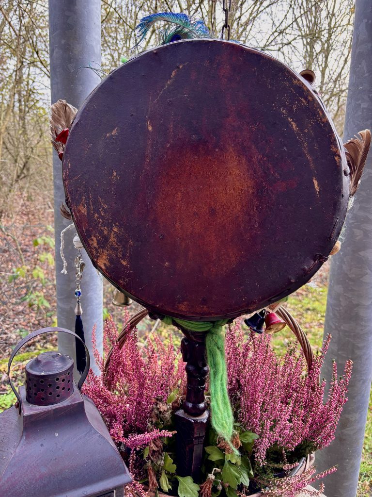 Sie ruft mich, meine Trommel, möchte an die frische Luft. Da steht sie nun ausgerichtet auf den Vollmond. Ich fühle mich verbunden, falle immer mehr in Trance. Mein inneres Sehen holt Bilder hervor, Seelenbilder des Erinnerns, lichtlos, leer in tiefer Dunkelheit. Ich erzähle vom vergessenen Licht des Glücks, der Freude und Lebenskraft. Ich wecke Hoffnung und Zuversicht – Vorfreude auf die nahende Nacht der Wintersonnenwende. Meine Trommel ist mir heute Bindeglied zwischen dem was lange Zeit getrennt von mir schien. Ich weiß, meine Trommel schafft Rückverbindung an verlorene Kraft meiner rückkehrenden Seelenanteile. Ich freue mich auf die Rückkehr im Licht der Weihnacht. Es ist endlich Zeit…..